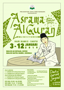Acara Asrama Al Qur’an (Tafsir Al Qur’an) ini dilaksanakan selama 10 hari. Berlangsung sejak hari Kamis, 3 Januari 2019 sampai Sabtu, 12 Januari 2019. Kegiatan asrama tafsir Al-quran ini bertempat di dua lokasi, yaitu di Masjid Arroyan Kepuh, Kecamatan Gondokusuman dan Masjid Baitul Hamdi Sidobali, Kecamatan Umbulharjo. Ada 3 sesi waktunya yaitu sesi pagi 05.00 WIB – 06.00 WlB, sesi sore 15.30 WIB – 17.30 WIB, sesi malam 19.30 WIB – 21.30 WIB.